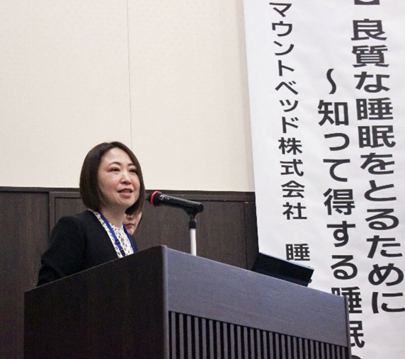パラマウントベッド㈱ 睡眠研究所 坂元 尚美様から「良質な睡眠をとるために ~知って得する睡眠の話~」というテーマで質疑応答も含めて約50分間の講演をいただきました。 本編の前に、同社熊本県担当営業の中島様よりパラマウントベッド様の「創業から今日までの歩み」についてご紹介があり、続いて坂元様より「睡眠の基礎知識」、「睡眠と健康」、「睡眠改善のポイント」という順にてクイズを交え、参加者の方々の興味を喚起しながら、ご自身の看護師としての体験に基づいた分かり易いご説明がありました。睡眠という誰もが関心のあるテーマながら、体系的に学ぶ機会は滅多に無く、参加者の皆様には、睡眠に関する総合的な理解をより深めていただけたかと感じています。特に「睡眠改善のポイント」では、日々の暮らしの中で実行し易い10項目の取り組み方法の話があり、多くの方がご自身の睡眠改善のヒントと実践への意欲を得られたようです。 |